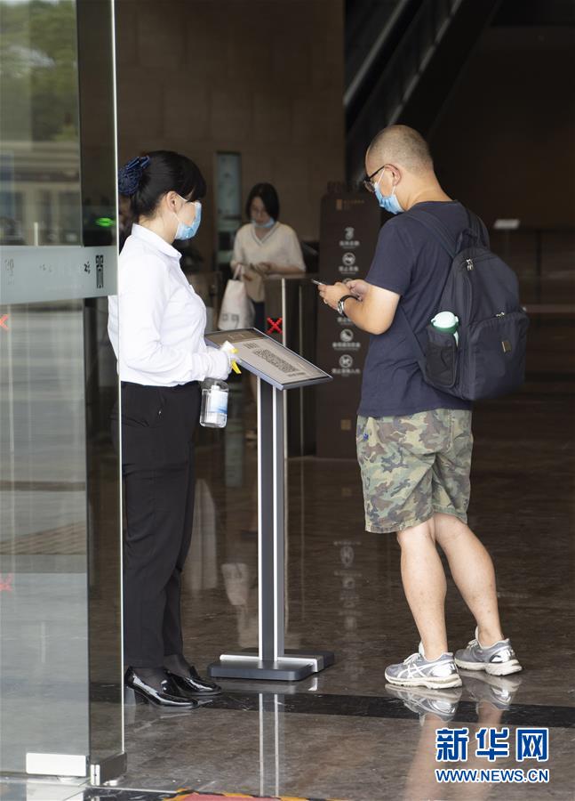 5月17日,在江西省博物館新館,參觀者入館前掃描“健康碼”。江西省博物館新館在做好疫情防控的前提下有序開放,公眾可通過網(wǎng)上預約參觀游覽。新華社記者張浩波攝