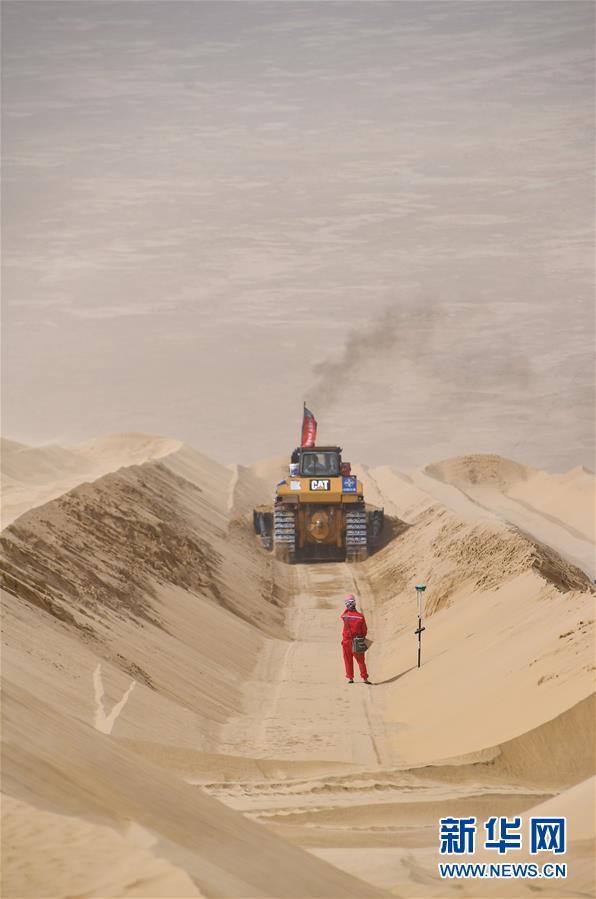 在新疆尉犁至且末沙漠公路施工現(xiàn)場(chǎng),測(cè)繪員劉耀軍在工作(5月17日攝)。新華社記者宋彥樺攝