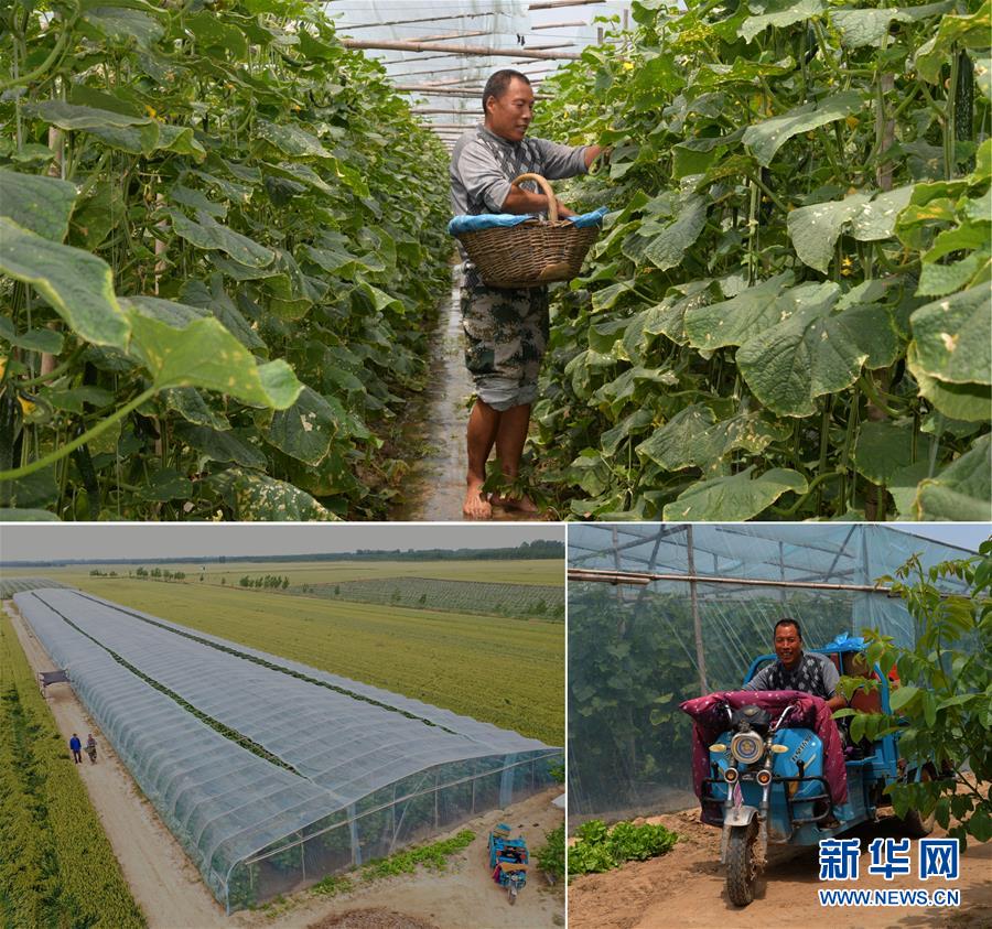 這是一張拼版照片(圖片均為5月16日攝)。上圖:在河南省開封市尉氏縣大橋鄉(xiāng)馮村,50歲的文海軍在他的黃瓜種植大棚內(nèi)采摘黃瓜;下左圖:在扶貧政策扶持下,文海軍蓋了占地6畝的蔬菜溫室大棚(無人機(jī)照片);下右圖:文海軍駕駛?cè)嗆囘\(yùn)輸采摘的黃瓜。新華社記者孫清清攝