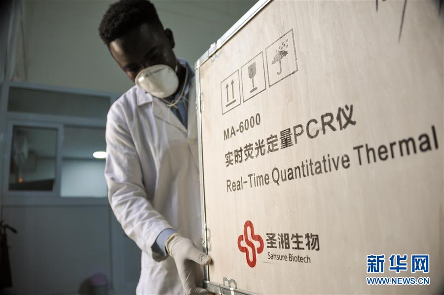在加納首都阿克拉,加納最大的連鎖藥品供應(yīng)商mPharma的工作人員展示從中國湖南圣湘生物科技股份有限公司進(jìn)口的檢測(cè)設(shè)備(2020年5月6日攝)。新華社記者許正攝