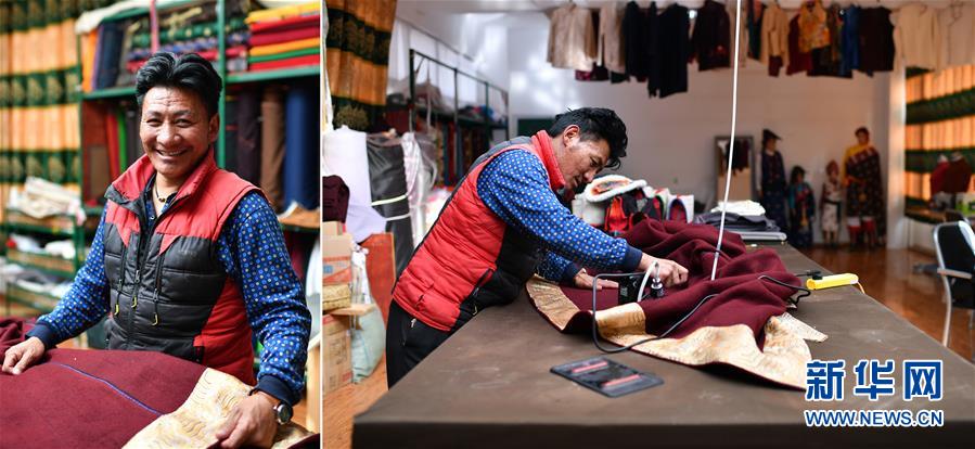 拼版照片:左圖為西藏昌都市江達(dá)縣字嘎鄉(xiāng)塔字村村民扎西江措;右圖為扎西江措在西藏昌都市江達(dá)縣格?;褡宸椉庸やN(xiāo)售公司制作藏裝。扎西江措學(xué)習(xí)藏裝縫制不到兩年時(shí)間,已經(jīng)是一名熟練的制衣工,現(xiàn)在月收入4000多元。在此之前,扎西江措靠放牧、四處打零工養(yǎng)活一家人(4月30日攝)。新華社記者詹彥攝
