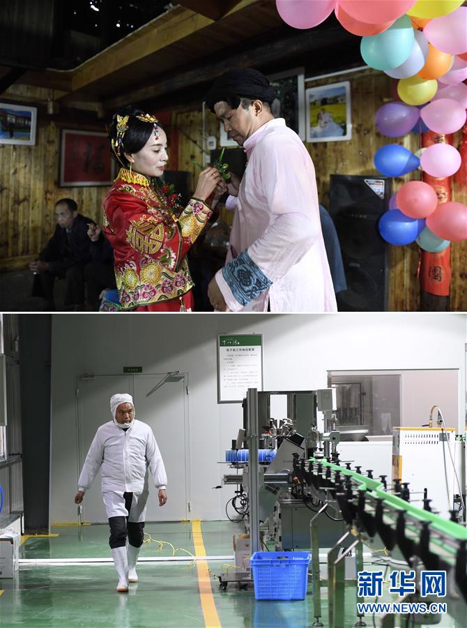 拼版照片上圖:婚禮開始前,吳春霞(左)為施六金佩戴胸花(2018年9月24日攝);下圖:施六金在十八洞村新建的山泉水廠里工作(2018年2月3日攝)。地處武陵山腹地的湖南湘西土家族苗族自治州花垣縣十八洞村曾深陷貧困。2013年,村里225戶中有136戶是貧困戶,40歲以上的“光棍兒”有30多人。2014年以來,十八洞村逐漸蛻變。2016年初,結(jié)束外出打工的施六金返鄉(xiāng)辦起“苗家樂”。2017年,村里的十八洞村山泉水廠正式建成投產(chǎn),他受聘成為廠里的技術(shù)工人,每月都有固定工資。隨著日子越過越好,許多像施六金這樣摘了窮帽的大齡“光棍兒”收獲了愛情,實現(xiàn)了安居樂業(yè),事業(yè)愛情雙豐收。黨的十八大以來,我們堅持以人民為中心的發(fā)展思想,明確了到2020年我國現(xiàn)行標準下農(nóng)村貧困人口實現(xiàn)脫貧、貧困縣全部摘帽、解決區(qū)域性整體貧困的目標任務(wù)。目前看,脫貧進度符合預期,成就舉世矚目。這些成績的取得,凝聚了全黨全國各族人民智慧和心血,是廣大干部群眾扎扎實實干出來的。脫貧摘帽不是終點,而是新生活、新奮斗的起點。新華社記者李尕攝