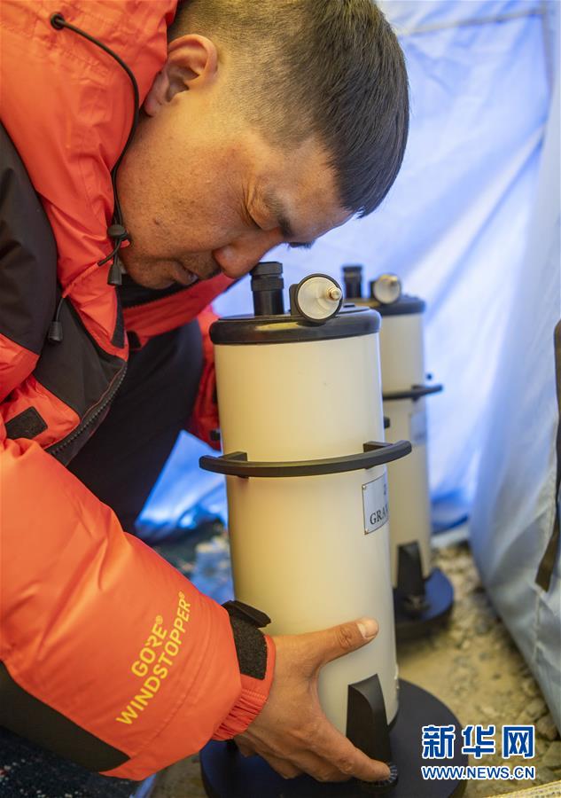 國測(cè)一大隊(duì)隊(duì)員在珠峰大本營(yíng)測(cè)試地面測(cè)量中使用的重力儀(5月3日攝)。新華社記者晉美多吉攝