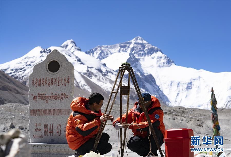 國(guó)測(cè)一大隊(duì)隊(duì)員在珠峰大本營(yíng)附近測(cè)試設(shè)備(5月17日攝)。新華社記者普布扎西攝