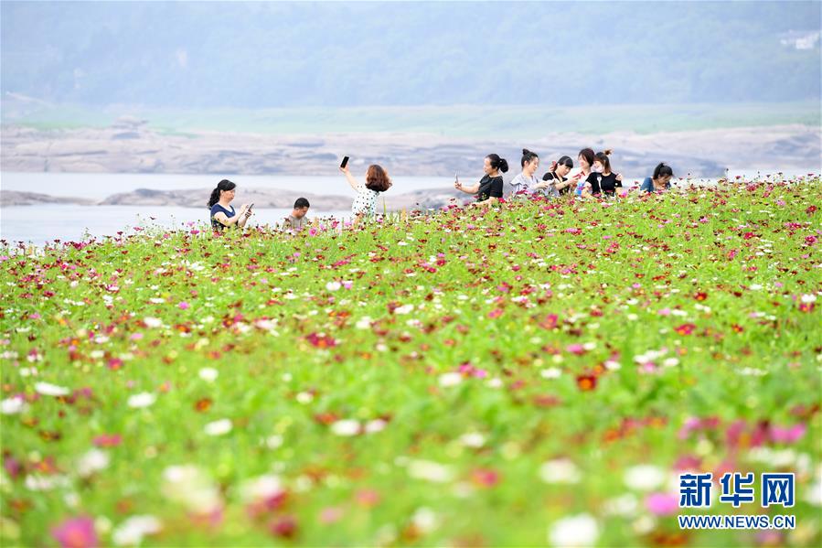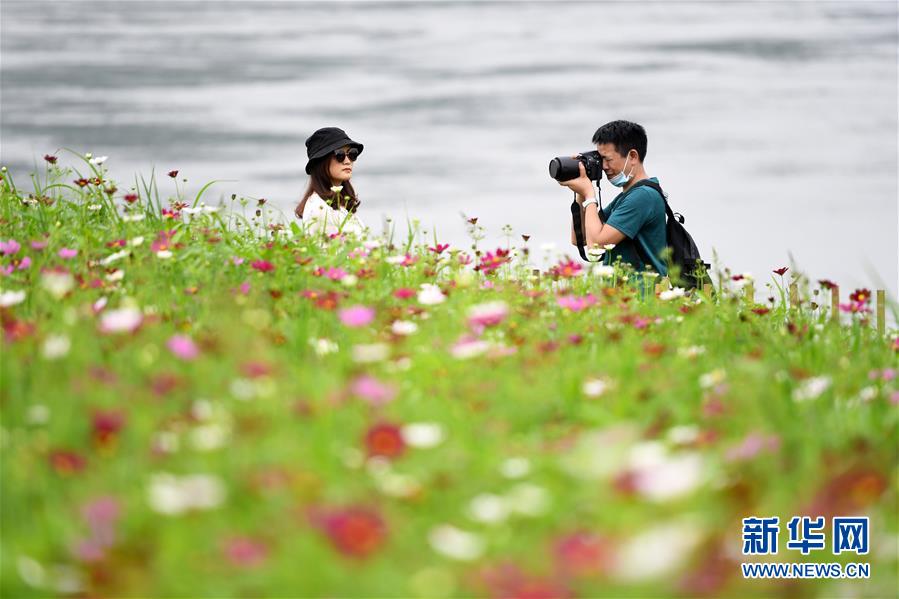 5月20日,在重慶市巴南區(qū)木洞鎮(zhèn)長江岸邊,游客在格?;êV杏瓮?。近日,重慶市巴南區(qū)木洞鎮(zhèn)長江岸邊的格桑花競相開放,吸引游客前來賞花觀景。新華社記者唐奕攝