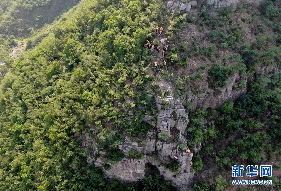 5月21日,捅山工胡軍從山頂垂降,準(zhǔn)備開始捅山作業(yè)。新華社記者郝源攝