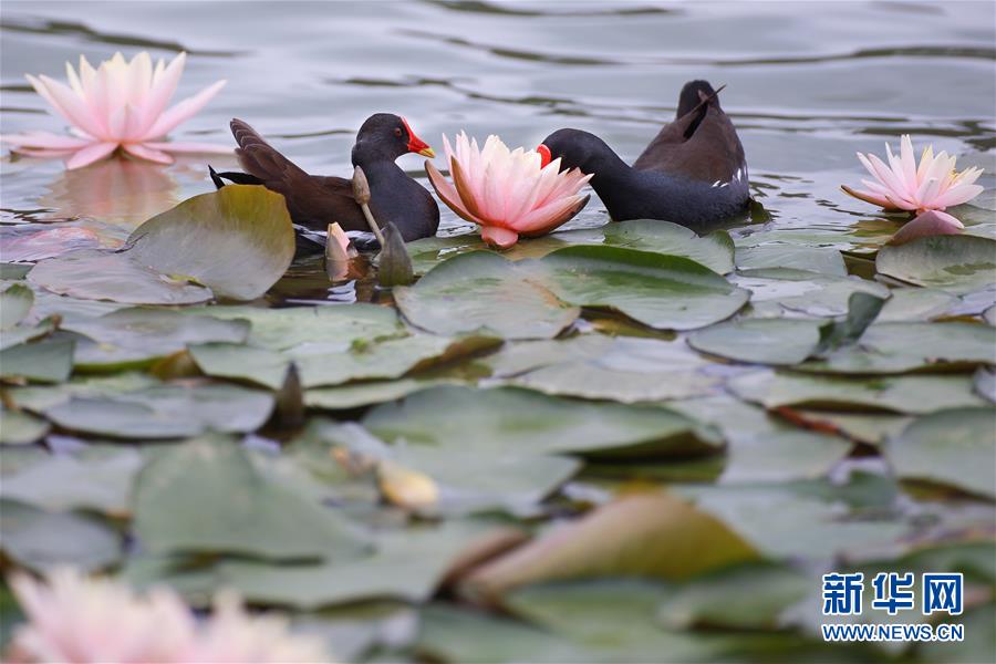 5月22日,兩只紅嘴水雞在蓮葉間覓食。近日,貴陽市觀山湖公園內(nèi)大片盛開的蓮花吸引了不少水鳥在其間嬉戲覓食。新華社記者劉續(xù)攝