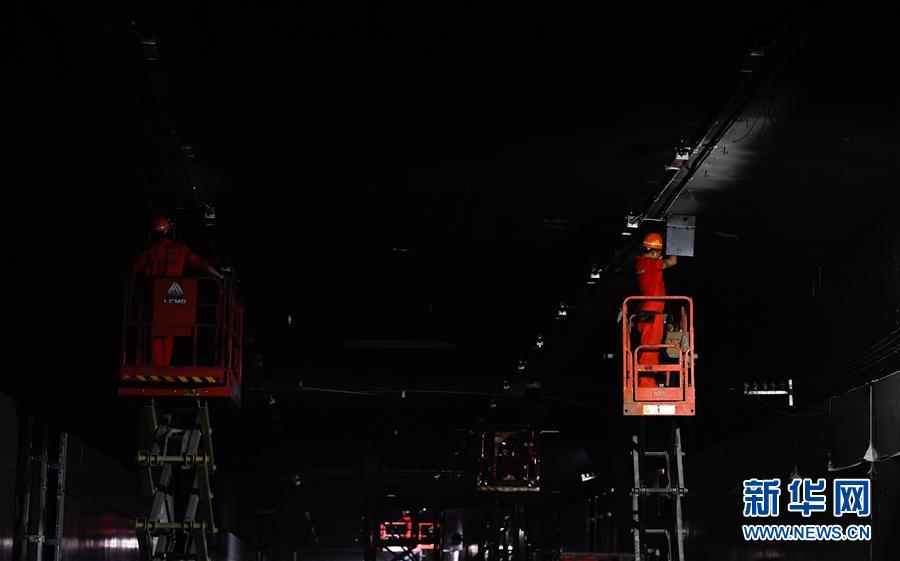 5月23日,工人在??谖拿鳀|越江通道項(xiàng)目隧道內(nèi)安裝照明設(shè)備。新華社記者楊冠宇攝