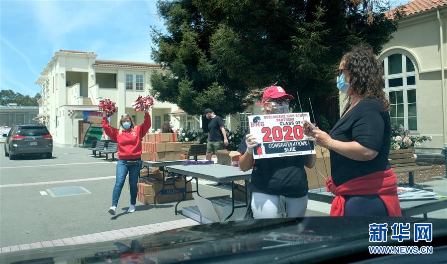 5月22日,在美國加州北部圣馬特奧縣,人們歡迎來辦理畢業(yè)手續(xù)的學(xué)生。新華社記者吳曉凌攝