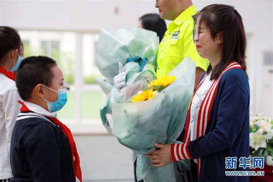 5月25日,北京市朝陽(yáng)區(qū)實(shí)驗(yàn)小學(xué)貴陽(yáng)分校的學(xué)生在上開(kāi)學(xué)第一課時(shí),為前來(lái)講課的抗疫醫(yī)生送上鮮花。新華社記者劉續(xù)攝