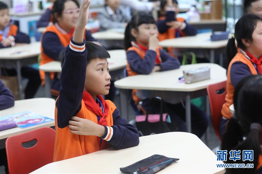 5月25日,貴陽市中天北京小學未來方舟校區(qū)一名學生在開學第一課上舉手發(fā)言。新華社記者歐東衢攝