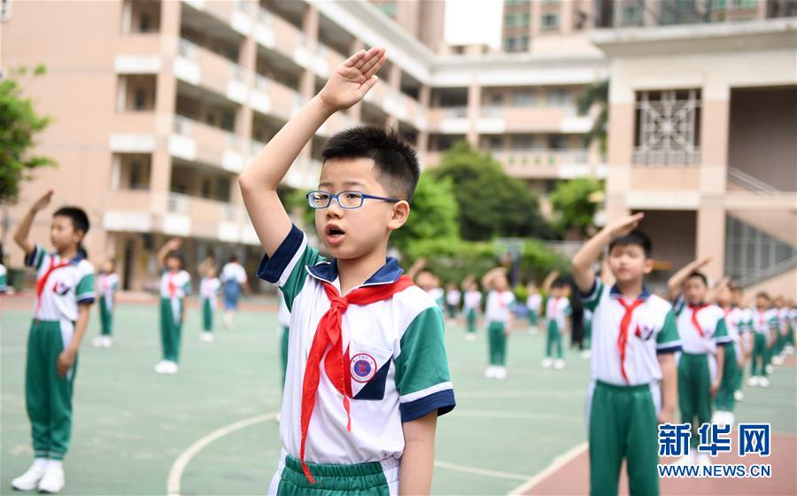 5月25日,廣州市荔灣區(qū)蔣光鼐紀(jì)念小學(xué)的學(xué)生在參加升國(guó)旗唱國(guó)歌儀式。當(dāng)日,廣州市各小學(xué)一至三年級(jí)學(xué)生正式開(kāi)學(xué)復(fù)課。至此,廣州市中小學(xué)各年級(jí)已全部開(kāi)學(xué)復(fù)課。新華社記者盧漢欣攝