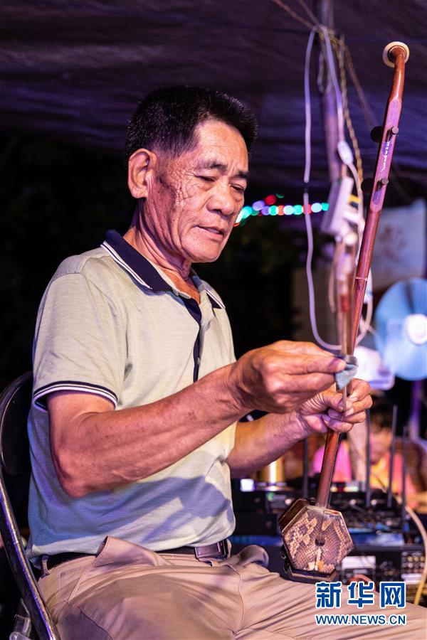 5月24日,海南臨高新風(fēng)人偶戲團成員在演出前調(diào)試樂器。新華社記者張麗蕓攝