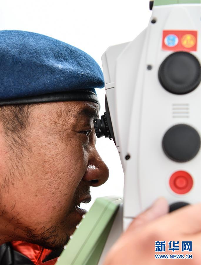 自然資源部第一大地測量隊隊員鄭林在使用全站儀對珠峰峰頂進行交會觀測(5月27日攝)。新華社記者晉美多吉攝