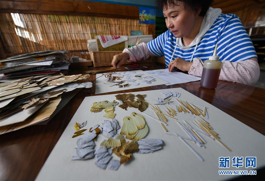 5月19日,在新疆博湖縣,手工藝人根據(jù)分解圖將經(jīng)過(guò)裁剪、燙色的蘆葦粘貼成完整的圖案。新華社記者宋彥樺攝