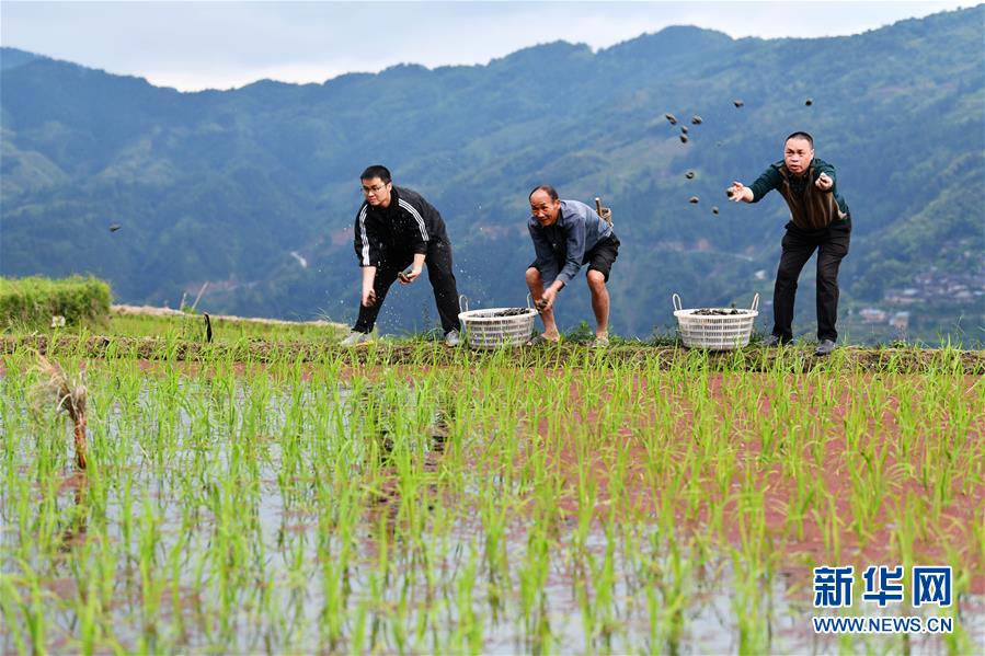 5月26日,貴州省從江縣加榜鄉(xiāng)加車村的村民在梯田上播撒種螺。