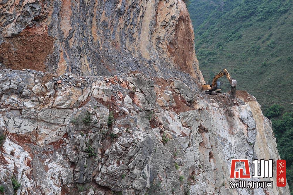 2020年5月27日,在貴州省畢節(jié)市納雍縣化作鄉(xiāng)雙巖頭村,挖掘機在觀音巖的懸崖邊修路。