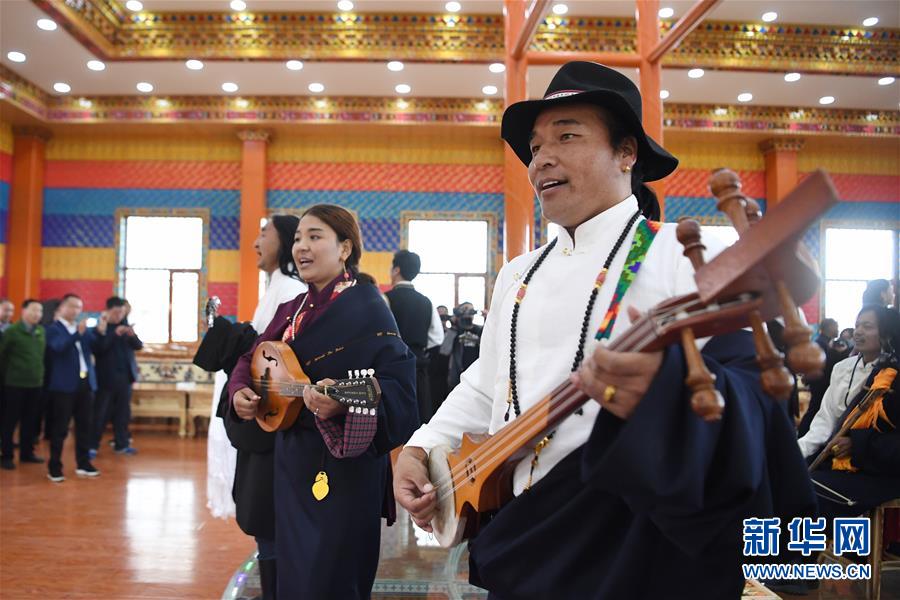 幾名藏族歌手在甘南藏族自治州瑪曲縣阿萬倉鎮(zhèn)沃特村的文化演藝大廳內(nèi)為游客彈唱(5月25日攝)。新華社記者陳斌攝