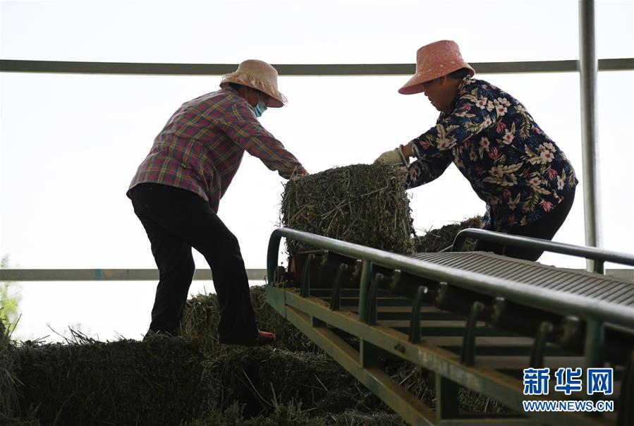 在平頂山市葉縣常村鎮(zhèn)月臺(tái)村扶貧車間倉庫,村民整理打好捆的艾草(5月27日攝)。