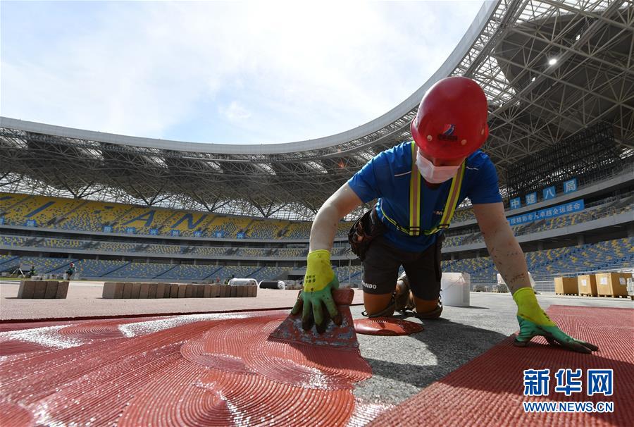 5月29日,工人在西安奧體中心體育場鋪設跑道。新華社記者張博文攝