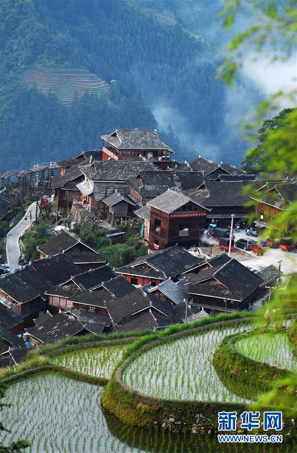 這是從江縣加榜鄉(xiāng)加車苗寨和梯田(5月28日攝)。夏日時(shí)節(jié),位于貴州省黔東南苗族侗族自治州從江縣加榜鄉(xiāng)加車、加頁(yè)、黨扭等苗寨的梯田在晨霧與陽(yáng)光的映襯下線條分明,光影變幻,景色如畫。新華社記者 楊文斌 攝