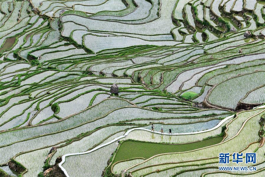 村民從從江縣加榜鄉(xiāng)黨扭梯田上經(jīng)過(5月26日攝)。夏日時(shí)節(jié),位于貴州省黔東南苗族侗族自治州從江縣加榜鄉(xiāng)加車、加頁(yè)、黨扭等苗寨的梯田在晨霧與陽(yáng)光的映襯下線條分明,光影變幻,景色如畫。新華社記者 楊文斌 攝