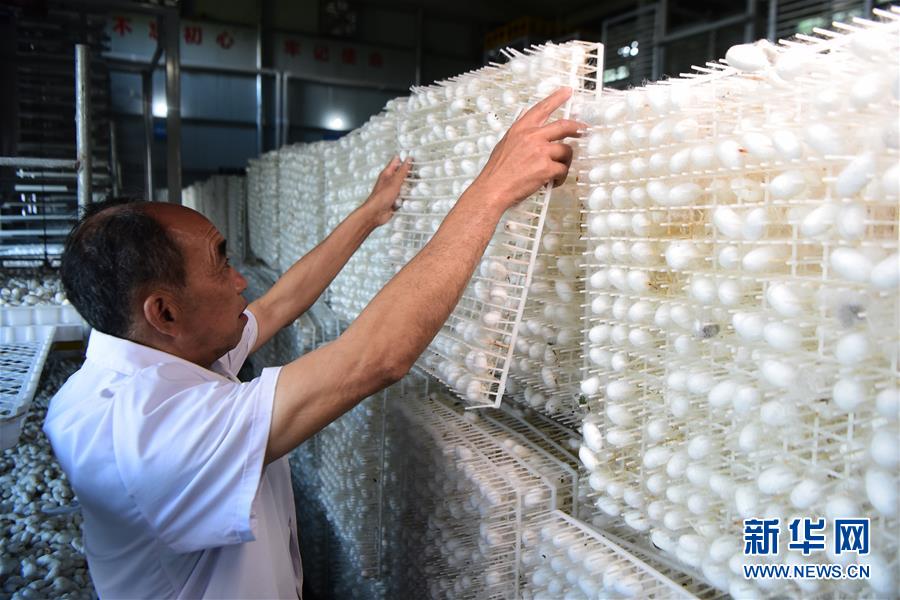 5月29日,奉節(jié)縣新民鎮(zhèn)中嶺村蠶桑產業(yè)扶貧基地工作人員在智慧蠶房內晾曬蠶繭。新華社記者 王全超 攝