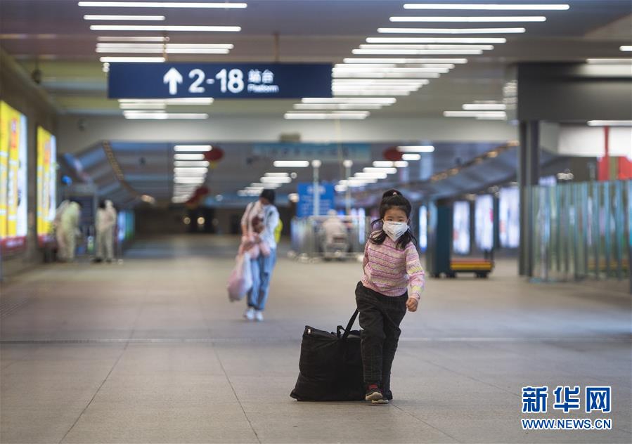 武漢恢復(fù)鐵路客站到達(dá)業(yè)務(wù)當(dāng)天,在武漢漢口火車站,一名小女孩拉著行李走在家長的前面(3月28日攝)。新華社記者肖藝九攝