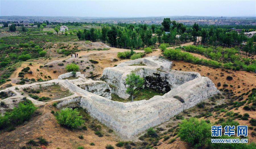 統(tǒng)萬城西南角城臺遺址(5月30日攝,無人機照片)。新華社記者劉瀟攝