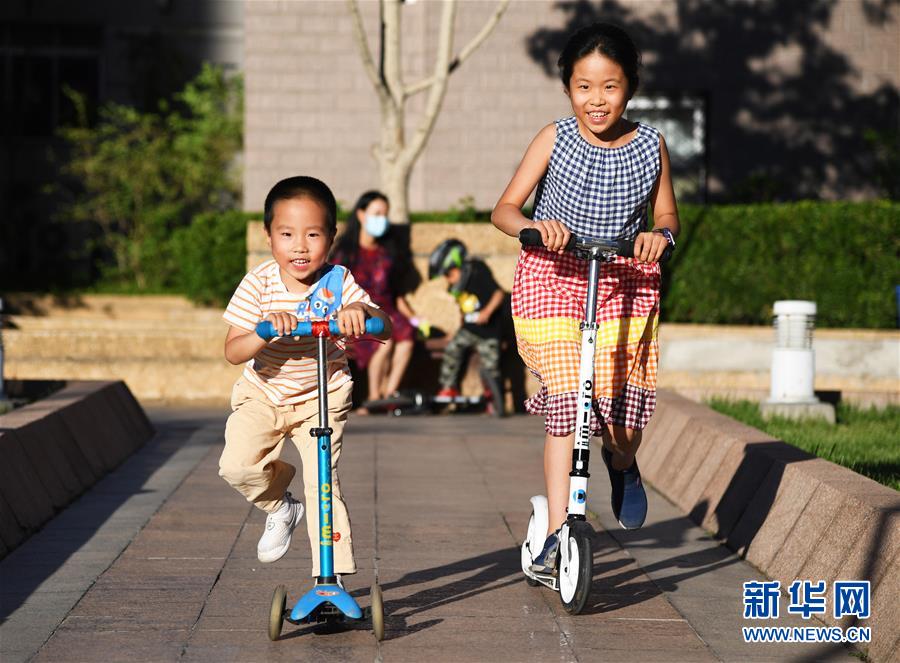 5月31日,在北京市海淀區(qū)中關(guān)村街道新科祥園社區(qū)廣場,小朋友們在玩耍。新華社記者任超攝