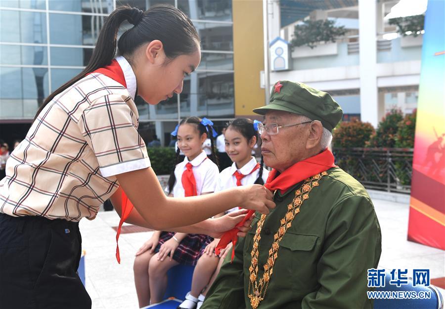 5月29日,少先隊(duì)員給李延年戴上紅領(lǐng)巾?!傲弧眹?guó)際兒童節(jié)來(lái)臨之際,“共和國(guó)勛章”獲得者、老一輩戰(zhàn)斗英雄李延年來(lái)到廣西南寧市濱湖路小學(xué)給孩子們講述戰(zhàn)爭(zhēng)年代的紅色故事,寄語(yǔ)他們好好學(xué)習(xí)、努力奮斗。孩子們向李延年贈(zèng)送了師生共繪的“紅色畫(huà)卷”,向老英雄致敬。新華社記者周華攝