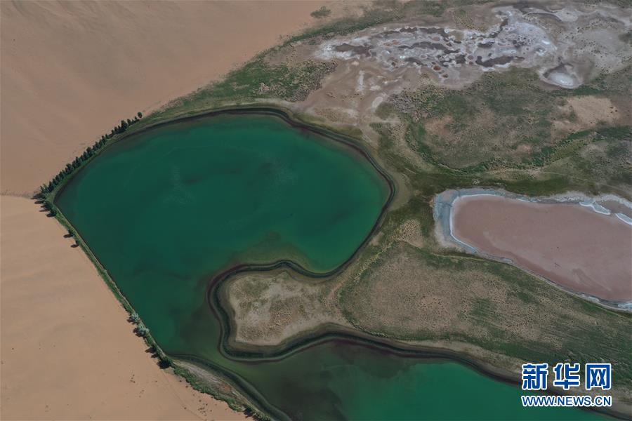 這是5月30日拍攝的巴丹吉林沙漠一處湖泊(無人機照片)。新華社記者徐欽攝。