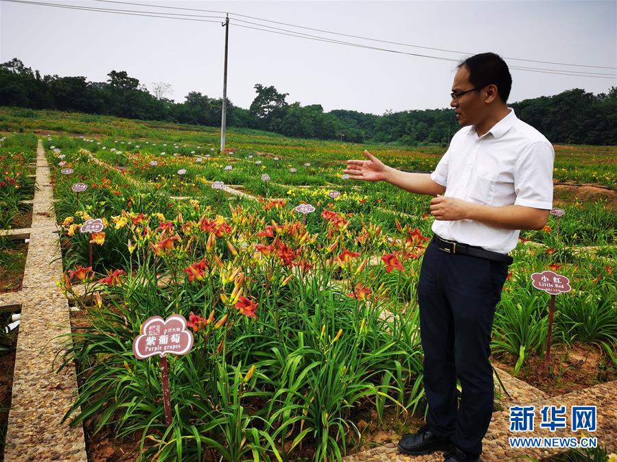 祁東縣金萱生物科技有限公司總經(jīng)理李祥勇在介紹中國黃花菜(萱草)良種繁育研究中心里的花卉品種(5月29日攝)。新華社記者袁汝婷攝