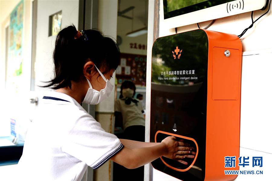 6月2日,上海閔行區(qū)鑫都小學(xué),一名小學(xué)生使用手部消毒智能霧化裝置。當(dāng)日,上海小學(xué)一、二、三年級學(xué)生返校開學(xué)。新華社記者張建松攝。