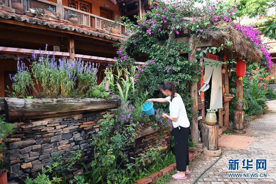 6月2日,云南丘北縣普者黑仙人洞村的一名女孩在自家客棧澆花。新華社記者楊宗友攝。