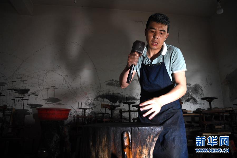 5月21日,安徽歙縣“項氏徽墨”的工人在捶打墨胚。新華社記者張端攝。