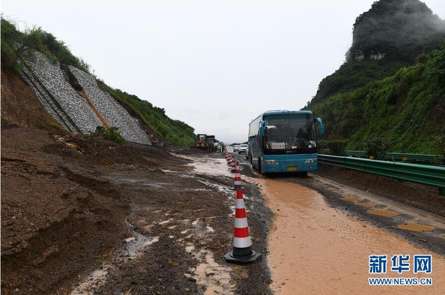6月7日,在廣西鹿寨至陽朔的高速公路上,車輛從一處發(fā)生滑坡的路段經過。新華社記者陸波岸攝