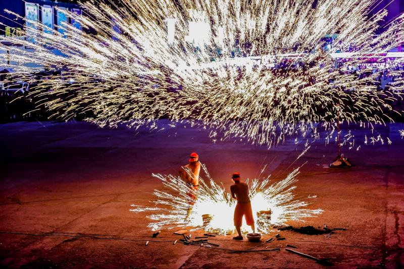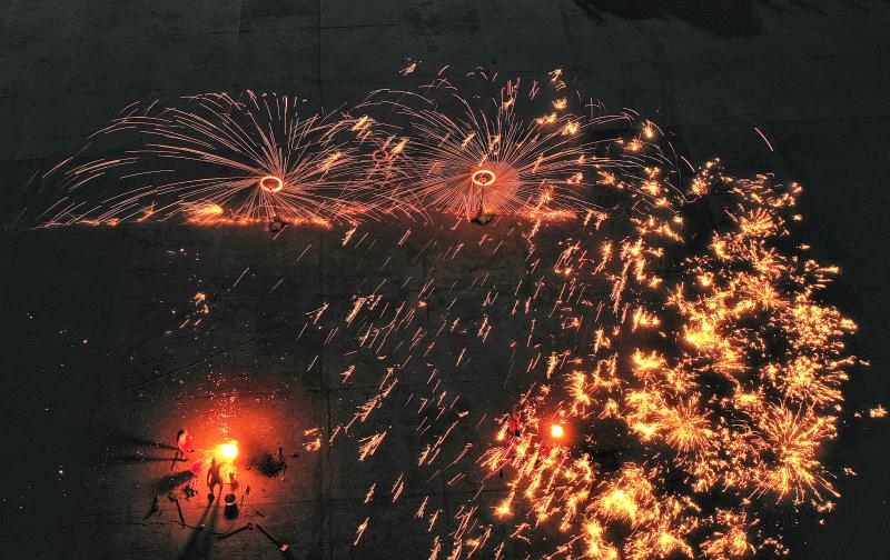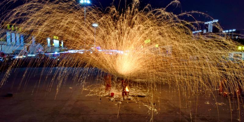 2020年6月7日晚8時(shí)許,吉林長(zhǎng)春青岡立交橋附近,古老打鐵花技藝首現(xiàn)長(zhǎng)春,1700度鐵水空中開花。