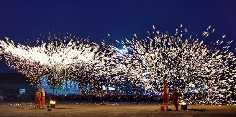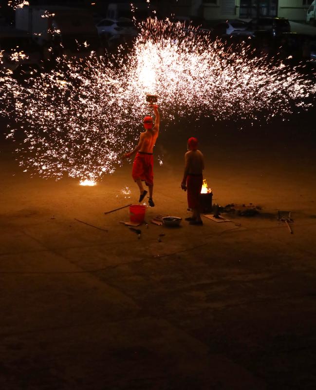 2020年6月7日晚8時(shí)許,吉林長(zhǎng)春青岡立交橋附近,神韻打鐵花表演隊(duì)改進(jìn)了傳統(tǒng)單一的擊打鐵花的形式,增添了空中轉(zhuǎn)花、高空散花、鋪地印花等多種花型。一柱鐵花沖天,在空中盤旋,朵朵銀花綻放給觀眾帶來(lái)了震撼的視覺享受。