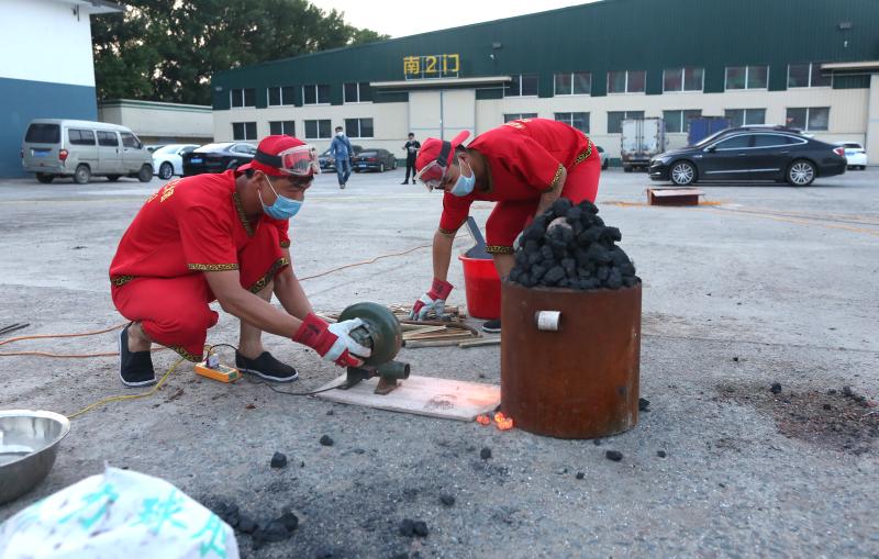 2020年6月7日晚8時(shí)許,吉林長(zhǎng)春青岡立交橋附近,演出前,準(zhǔn)備一座熔化鐵汁的熔爐,用大風(fēng)匣鼓風(fēng),把事先準(zhǔn)備好的生鐵化成鐵汁待用。打鐵花用的鐵水需要加熱到1700℃,即看到鐵水迸出金花才行。打鐵花雖然好看,但表演卻極具危險(xiǎn)性,隊(duì)員經(jīng)常被燙傷。表演隊(duì)隊(duì)長(zhǎng)朱震介紹說(shuō)。