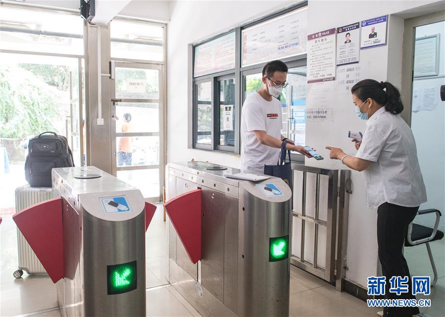 6月8日,在武漢大學,返校學生掃健康碼以及測體溫后進入宿舍。6月8日起,武漢大學、華中科技大學、武漢理工大學、華中師范大學等多所武漢高校迎來首批返校畢業(yè)生。新華社記者肖藝九攝