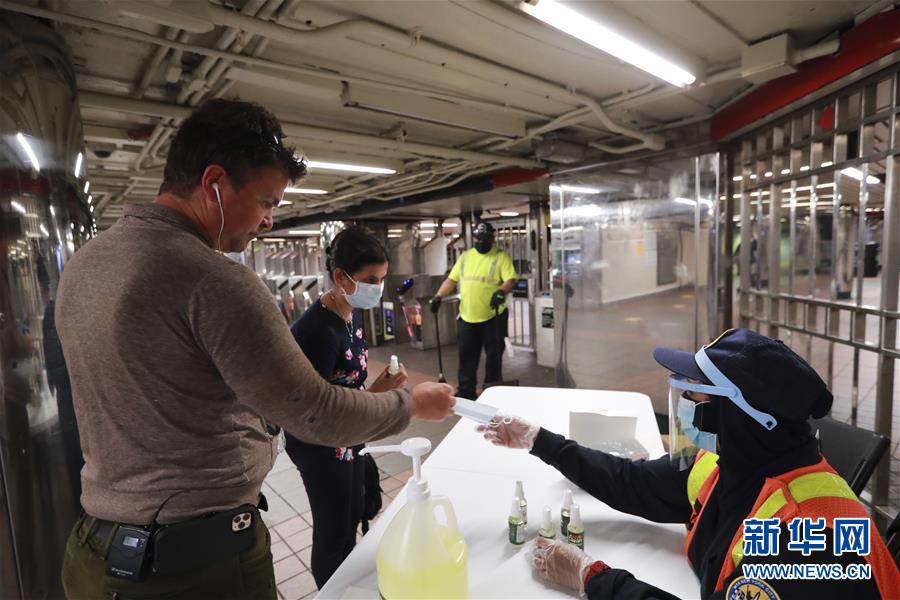 6月8日,在美國(guó)紐約,地鐵工作人員為乘客發(fā)放洗手液和口罩。在因新冠疫情進(jìn)入“居家令”近三個(gè)月之后,美國(guó)紐約市于當(dāng)?shù)貢r(shí)間8日開(kāi)始“解封”,進(jìn)入經(jīng)濟(jì)重啟的第一階段。新華社記者王迎攝