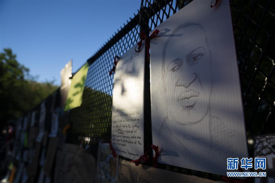 6月8日,美國華盛頓白宮附近的隔離圍欄上貼著喬治·弗洛伊德的畫像。新華社記者劉杰攝