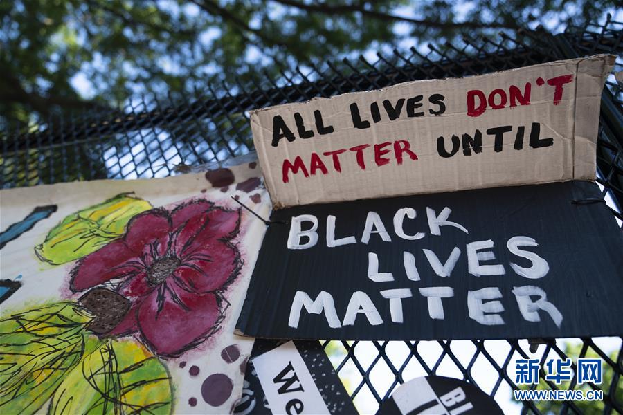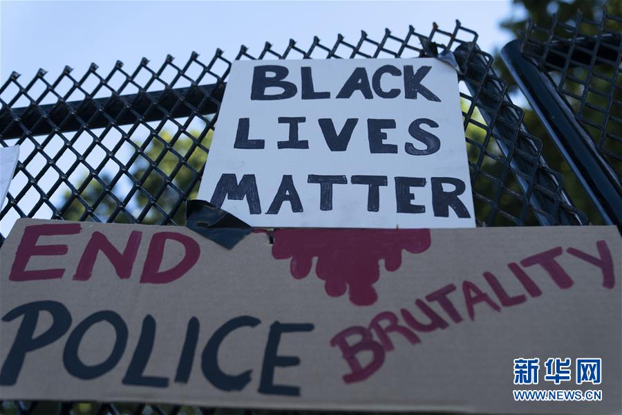6月8日,美國華盛頓白宮附近的隔離圍欄上貼著抗議標語。新華社記者劉杰攝