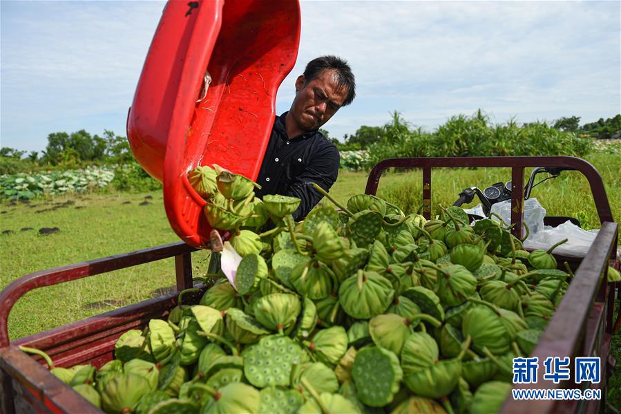 6月9日,村民在??邶埲A區(qū)龍泉鎮(zhèn)椰子頭村裝運采摘的蓮蓬。初夏時節(jié),位于海南海口龍華區(qū)龍泉鎮(zhèn)的蓮蓬逐漸成熟,當(dāng)?shù)卮迕窦泳o采摘,一派繁忙景象。新華社記者蒲曉旭攝