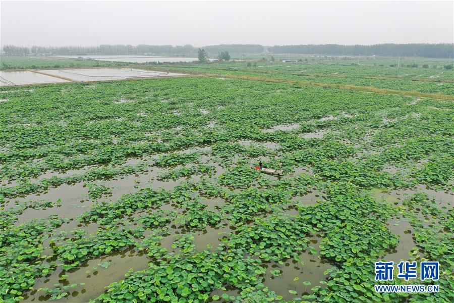 6月9日,在宿遷市宿城區(qū)中揚鎮(zhèn)一家淺水藕套養(yǎng)小龍蝦合作社,工人在給小龍蝦喂飼料(無人機照片)。新華社記者季春鵬攝