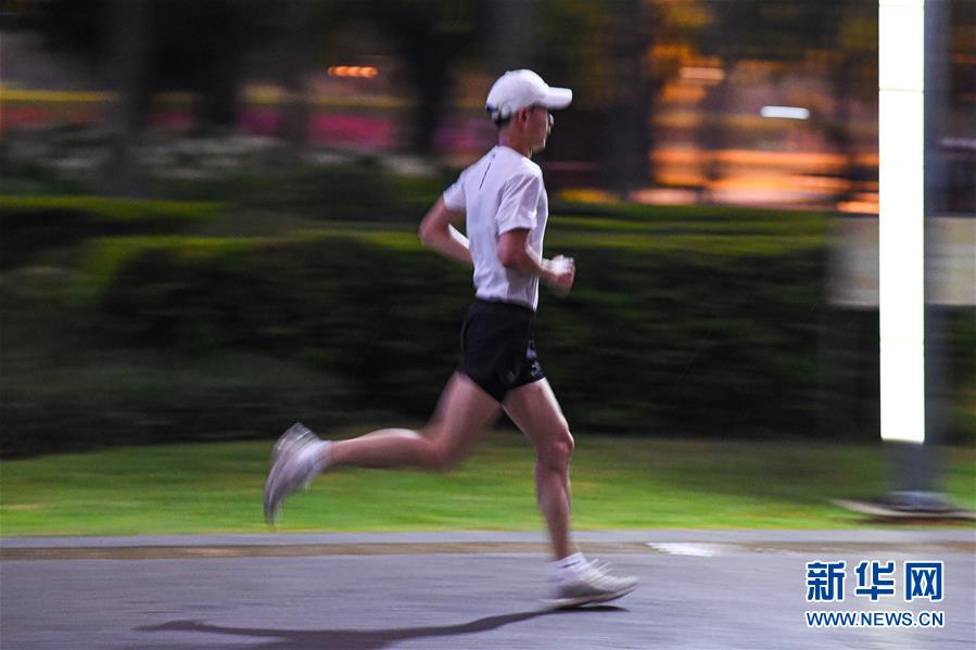 一位市民在海口萬綠園夜跑(5月28日拍攝)。近年來,夜跑成為越來越多都市人熱衷的健身方式之一。在海南???,每當(dāng)夜幕降臨,“夜跑族”來到海口萬綠園、世紀(jì)公園等夜跑場所跑步,用一身酣暢淋漓的汗水?dāng)[脫白天工作中的壓力,享受跑步帶來的歡愉。新華社記者 蒲曉旭 攝