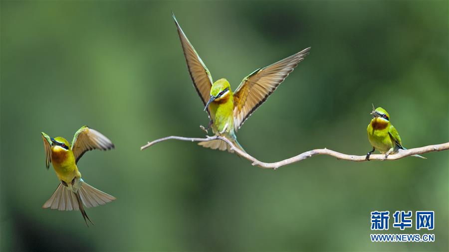 栗喉蜂虎在福建省晉江市深滬鎮(zhèn)科任村一山坡上覓食嬉戲(6月12日攝)。入夏以來(lái),逾百只栗喉蜂虎飛臨閩南晉江市深滬鎮(zhèn)科任村筑巢棲息。新華社記者記者梅永存攝。