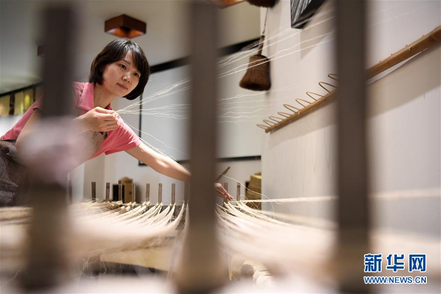 6月12日,在重慶榮昌的天運夏布會館,非遺傳承人馬琳沁在展示傳統(tǒng)夏布生產工藝——牽線。新華社記者 唐奕 攝