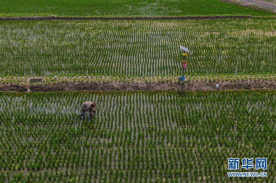 6月17日,農(nóng)民在盤錦市盤山縣太平街道張家村的稻田間查看水稻秧苗生長情況。新華社記者 潘昱龍 攝